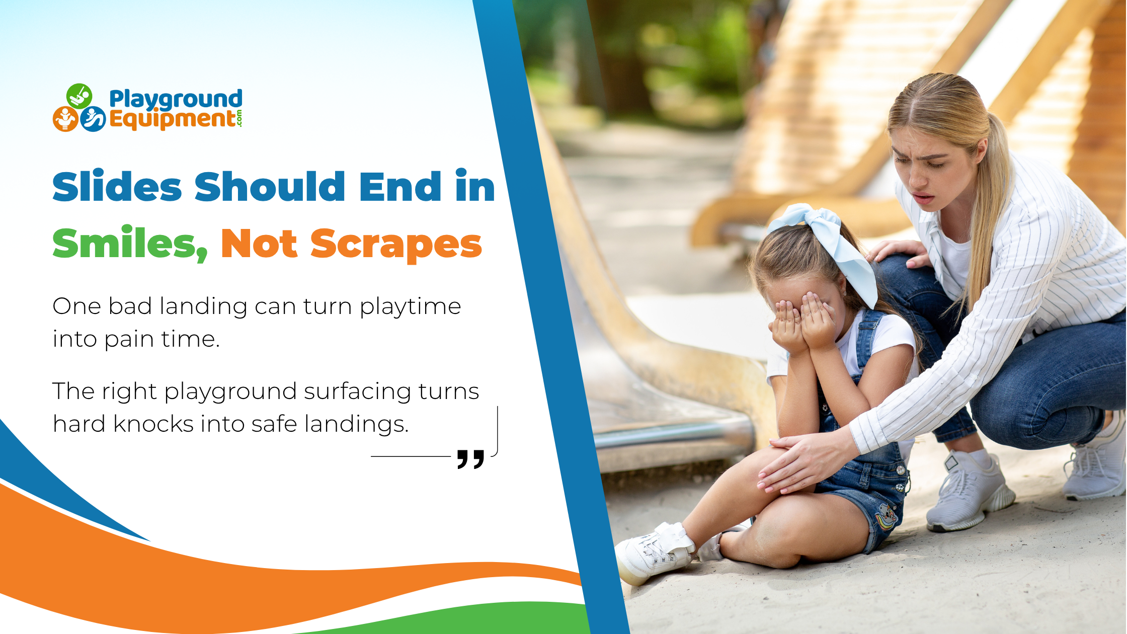 Most playground injuries come from falls, and what a child lands on matters just as much as how they fall. Hard-packed dirt and asphalt offer zero impact absorption, while grass quickly wears down into unforgiving soil—creating hidden playground hazards beneath a deceptively soft surface.