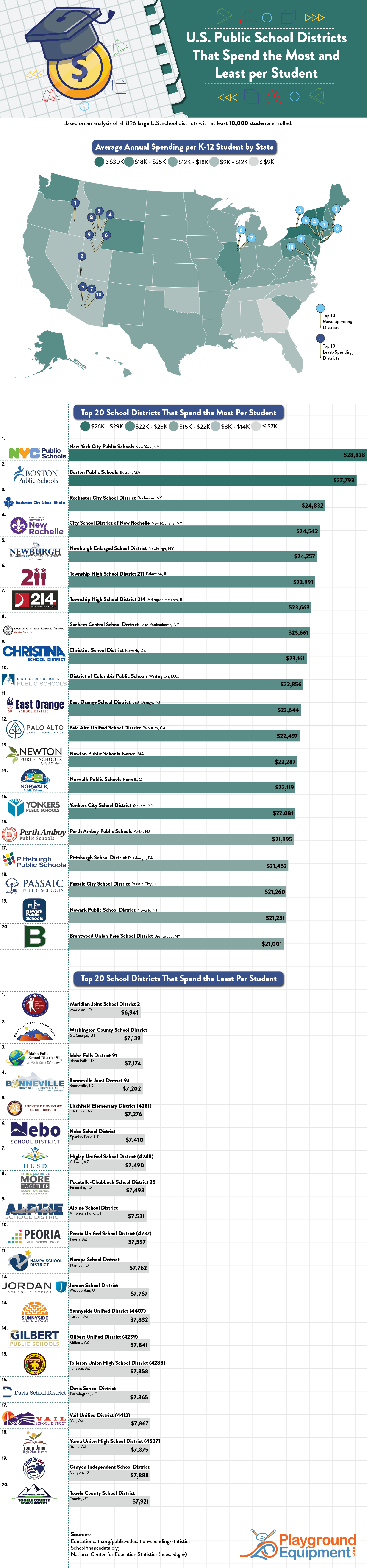 Public education is a vital cornerstone to the success and progress of nations across the globe. Part of why we pay taxes is to provide the funding that makes public education possible. How much does public education cost per student in the United States? According to the U.S. Census Bureau, public school spending per student reached $14,347 in 2021, making it the largest fiscal year-over-year increase since 2008. Since public school spending per pupil varies dramatically by state and by district, the team at Playground Equipment has delved into public school spending data to create this visualization revealing the school districts that spend the most and least per student across the country: