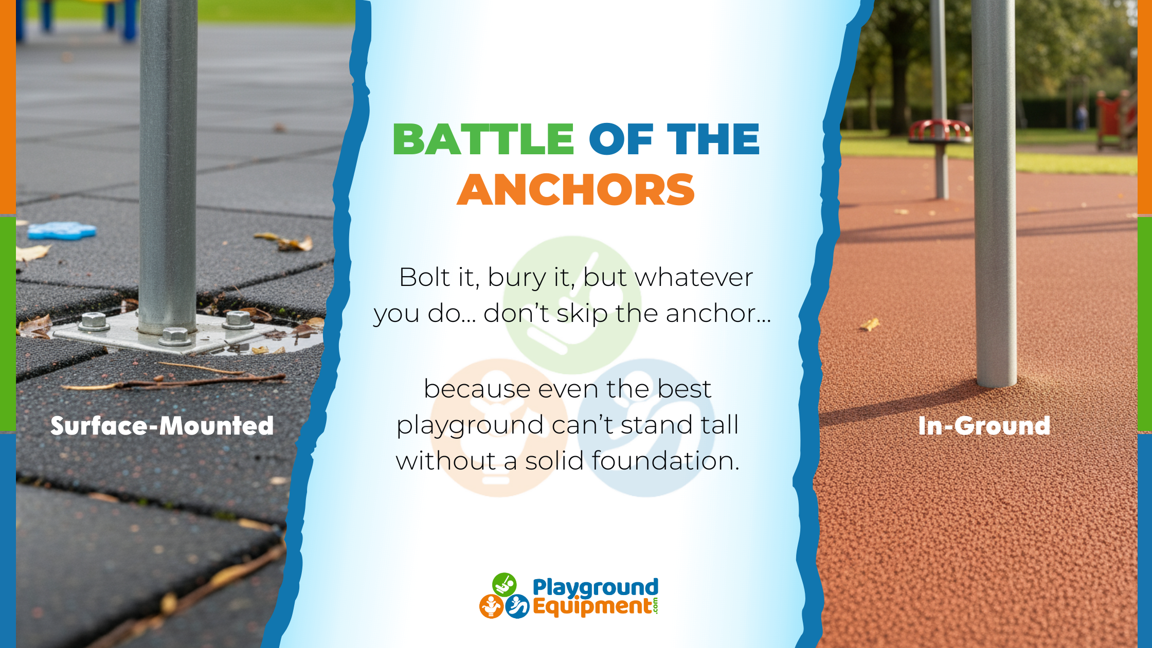 Not all equipment faces the same demands. Smaller, lighter structures for toddlers may perform well with surface-mounted systems. Larger, taller structures built for older children are safer with the added depth and security of in-ground anchoring.