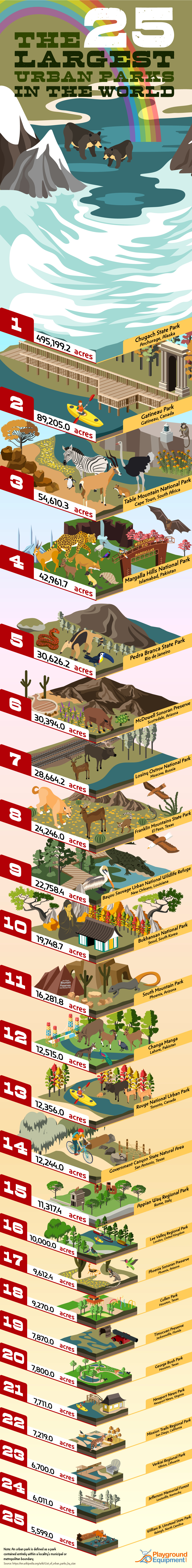Urban parks are profoundly valuable for the health and well-being of people of all ages, the community as a whole, the environment and its inhabitants, and even the economy. At Playground Equipment, we love to showcase opportunities for play, conservation, and community health, so we have created this visual guide to the largest urban parks in the world!