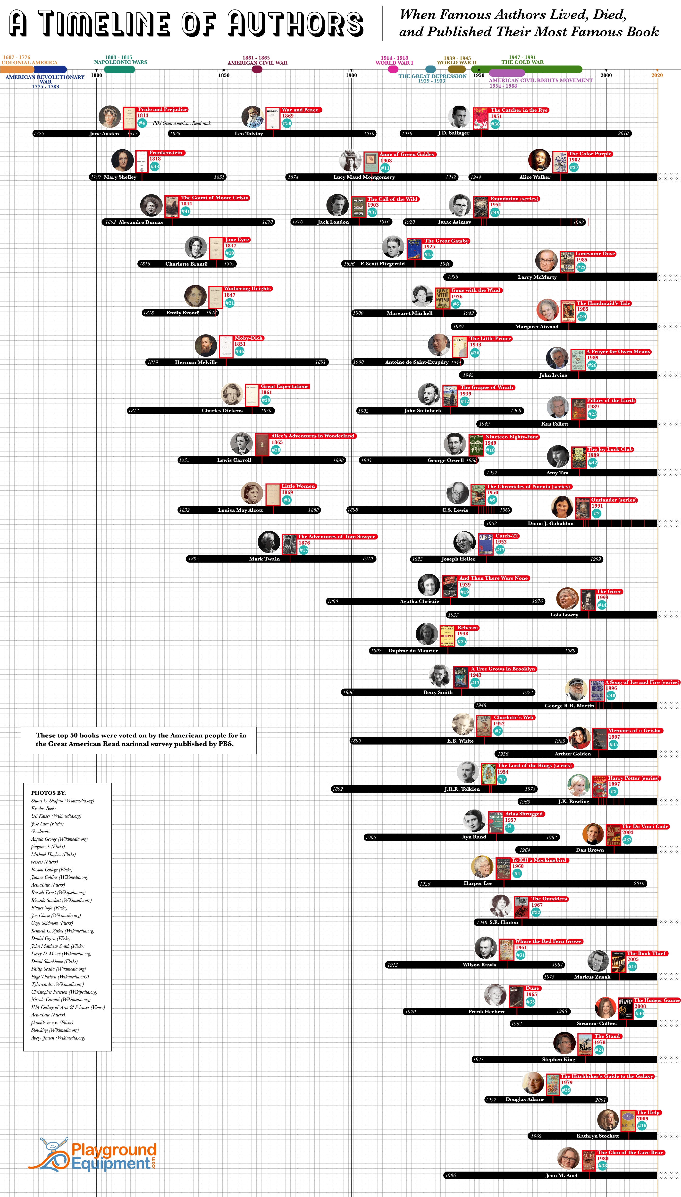Books aren't written in a vacuum: The history of literature is not divorced from history as a whole. They intersect and influence each other, as we've mapped out in this American literature timeline. Using the 100 most popular books from the Great American Read list, a survey that asked thousands of Americans what their favorite books were, we've created an author timeline highlighting each of these 100 major works of literature. The timeline of writers also shows when each author lived and died as well as what eras they lived through, including the tumultuous events of the 19th and 20th centuries. This list contextualizes the lives of some of the most beloved American and British authors.